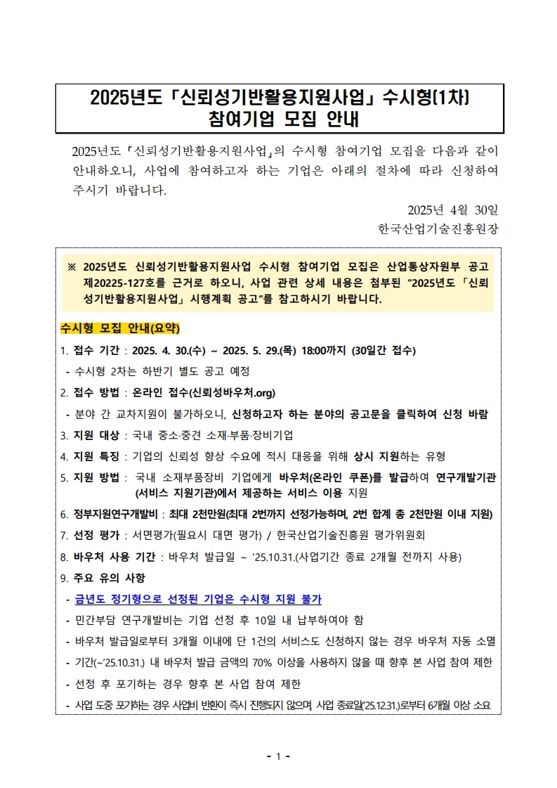 2025년도 「신뢰성기반활용지원사업」 수시형1차 참여기업 모집 안내.hwpx (1.1M)