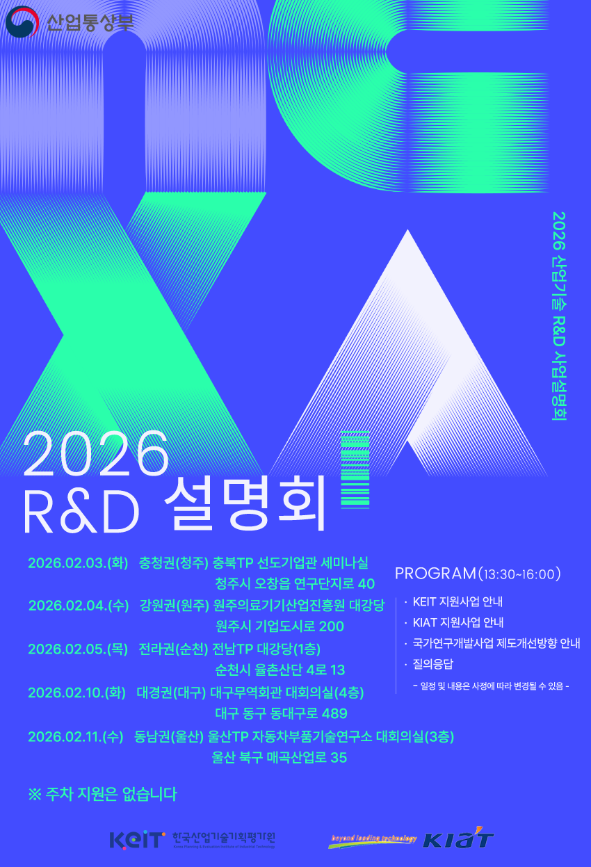 페이지 정보 작성자 관리자 작성일 26-01-23 15:26 목록 게시판 리스트 옵션 분야 기타 출처 한국산업기술기획평가원 접수기간 2026-02-03 ~ 2026-02-11 제목 2026 산업기술 R&D 사업 설명회 기타사항